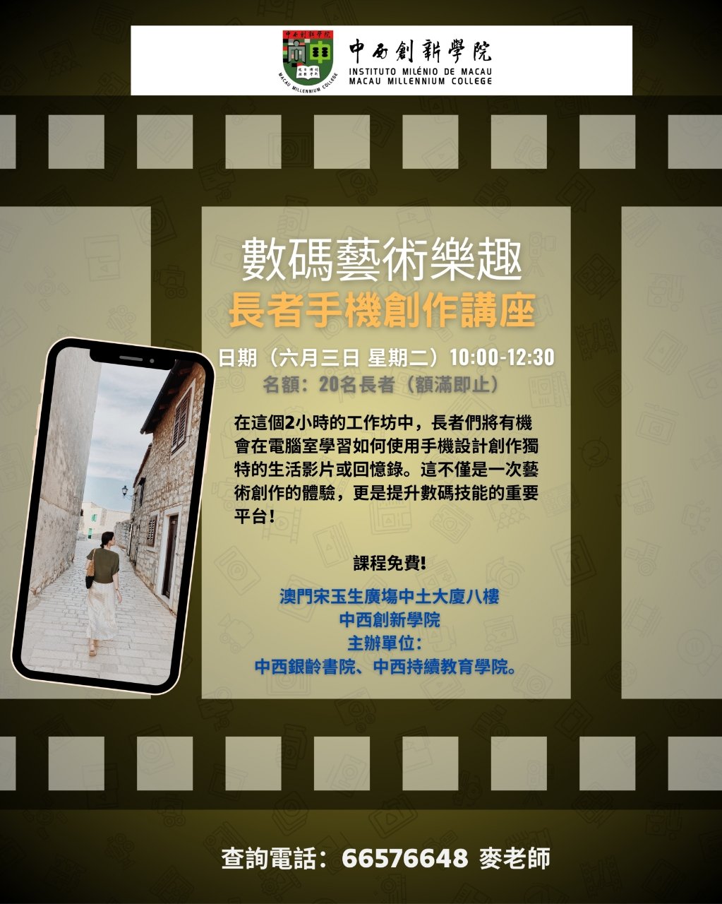 2025.6 本中心承辦由中西創新學院主辦的中西銀齡書院長者數碼藝術樂趣手機創作課程。本次課程近30位長者學員積極參與,平均年齡達71歲,目標以倡導「老有所學、老有所樂、老有所為」為核心,推動長幼互助、鄰舍守望和社會關懷,幫助長者重新定義銀齡人生,打造學習新科技知識、結交新朋友、享受新生活的平台。