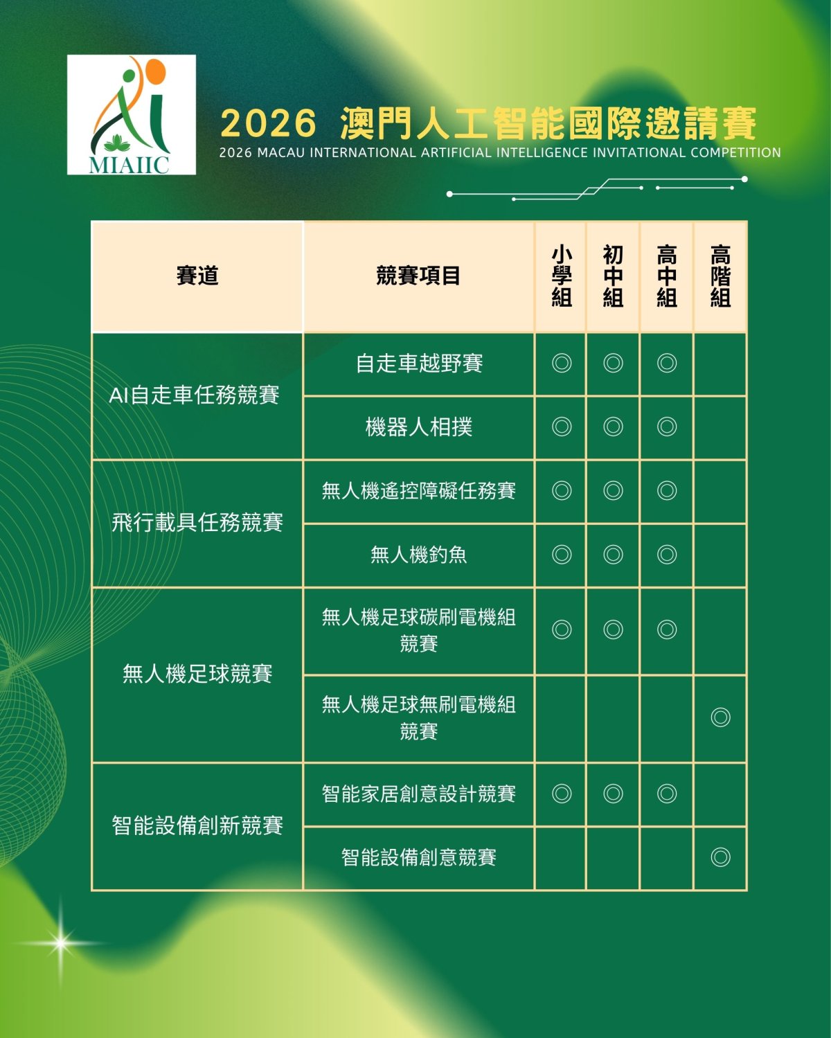 2026澳門人工智能國際邀請賽共有6個賽道,8個賽項,依照年齡分成4個組別,報名時每一個賽項的每一個組別必須單獨填寫報名表。
